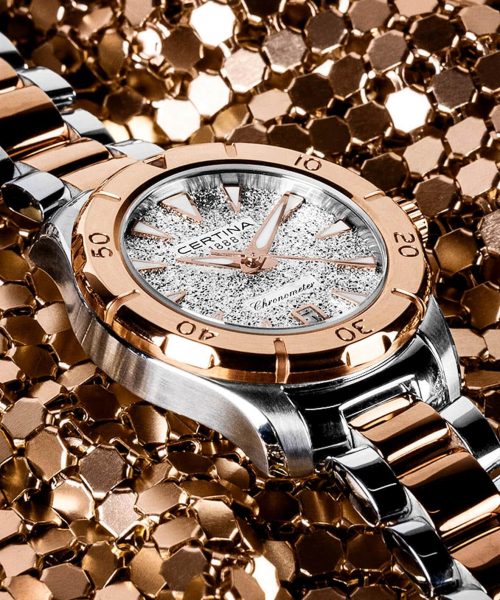 En glitrende nyhet fra Certina med stål og rosegull PVD samt en «spraglende» skive.Klokken har en vanntetthet på 200m og safirglass som gjør den til den perfekte bruksklokken men likevel flott til penere anledninger!