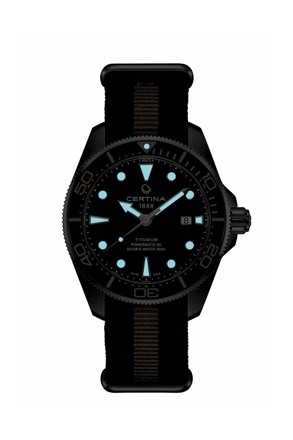 Certina DS Action i ny drakt, nå med keramisk bezelring. Her i en utgave i titan. Uret måler 43mm og har antirefleksbehandlet safirglass samt at det er vanntett til 300m (ISO 6425) og skrukrone. Det har Powermatic 80 urverk som har 80 timers gangreserve.