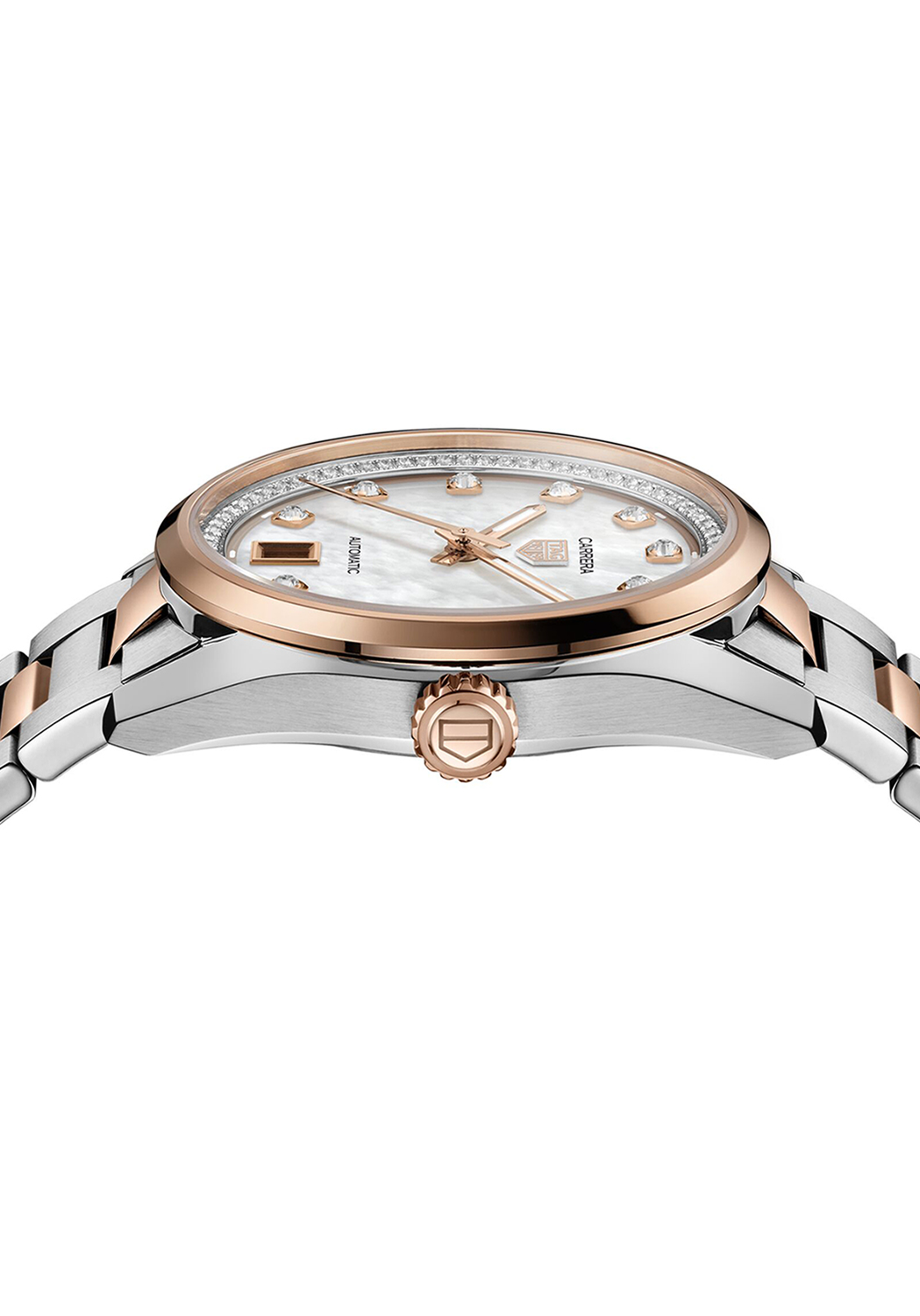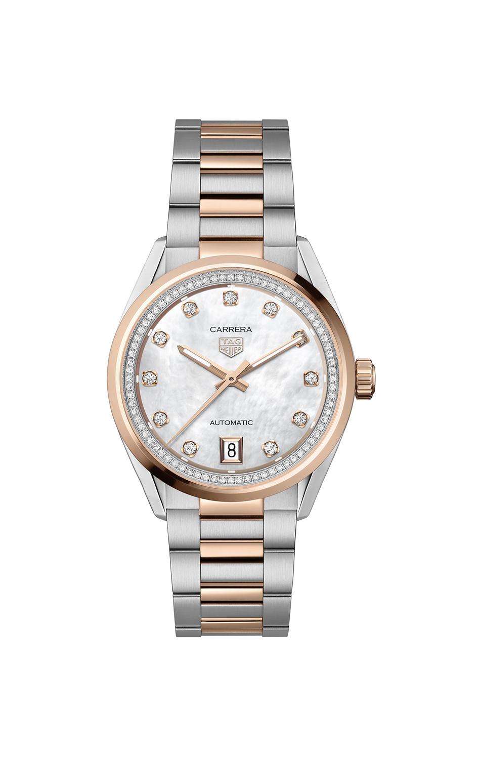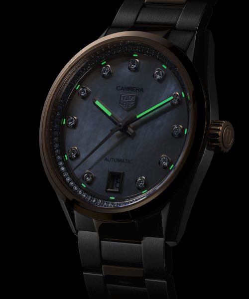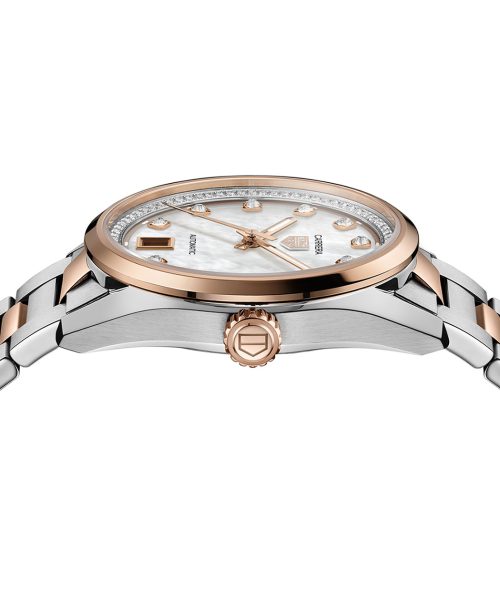 Den hvite perlemorskiven, utsmykket med et gradientspor og en strålende flens satt med 76 diamanter (0,288 ct), viser 18K 5N rosegullbelagte indekser satt med 11 VS+ diamanter (0,22 ct).