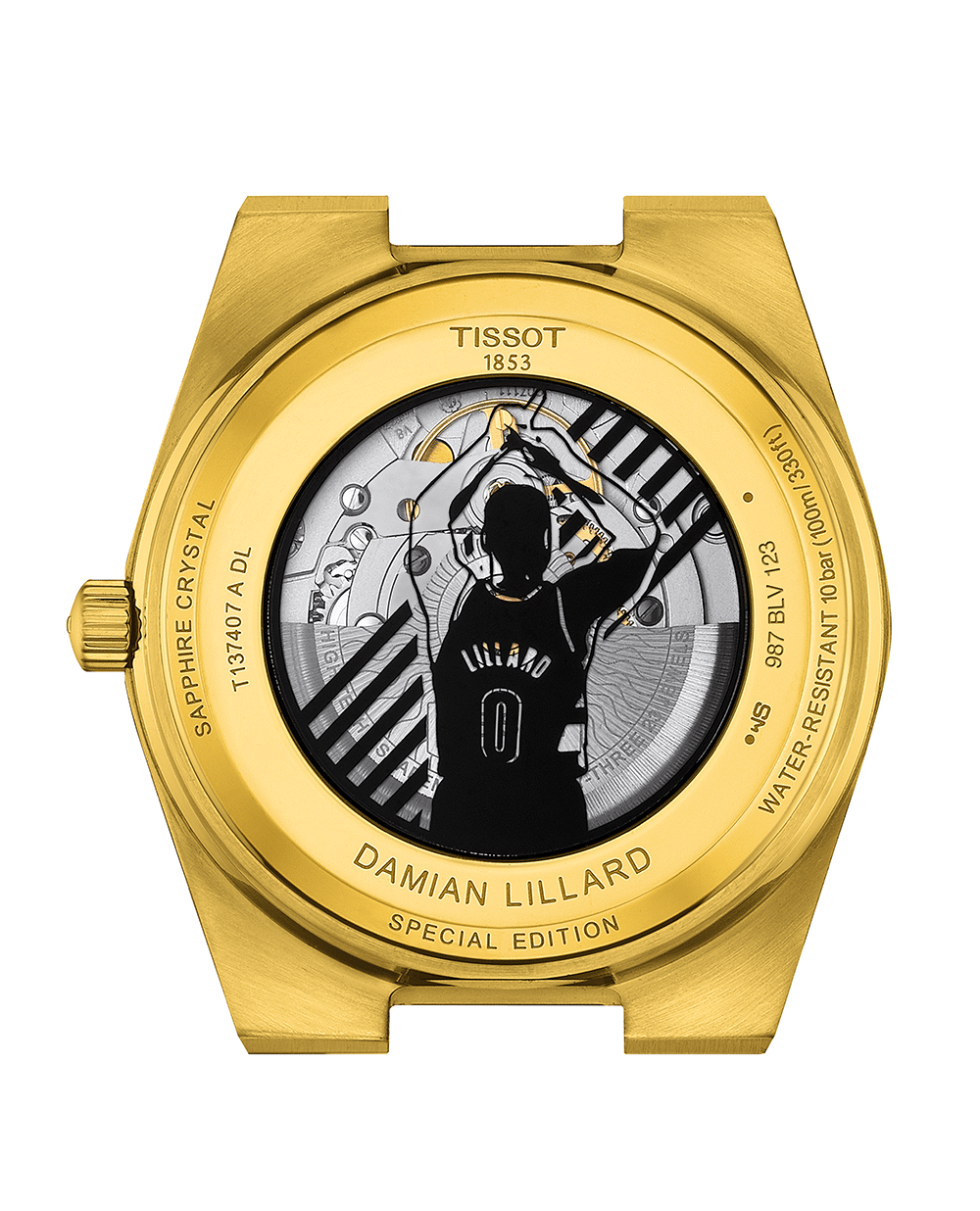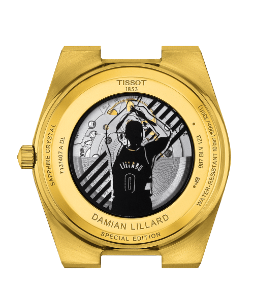 Denne spesialutgaven blander de velkjente egenskapene til PRX Powermatic 80 med unike elementer som gjenspeiler Lillards personlighet og karriere. Basert på gull PVD-modellvarianten, har dette uret en tydelig svart urskive preget med tallet ‘0’, et nikk til Lillards trøyenummer. Den andre hånden inneholder Damians monogram, en subtil, men likevel meningsfull endring. På den andre siden av klokken tilbyr den gjennomsiktige baksiden av etuiet et unikt utseende: den berømte «Dame Time»-feiringen. Dette elementet legger til et lag med dybde og fortelling til klokken.